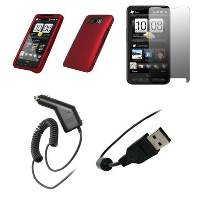 HTC HD2 - Red Rubberized Snap-On Cover Hard Case Cell Phone Protector + Crystal Clear Screen Protector + Rapid Car Charger + USB Data Charge Sync Cable for HTC HD2 Reviews